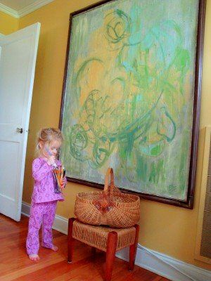 I remembered a post from my friend Meredith ages ago, when she bought a Craigslist painting and immediately had buyer’s remorse. But she rectified it by having her daughter paint on top, and it looked amazing. Because it’s huge:
