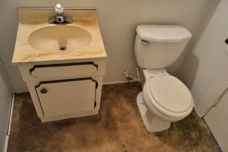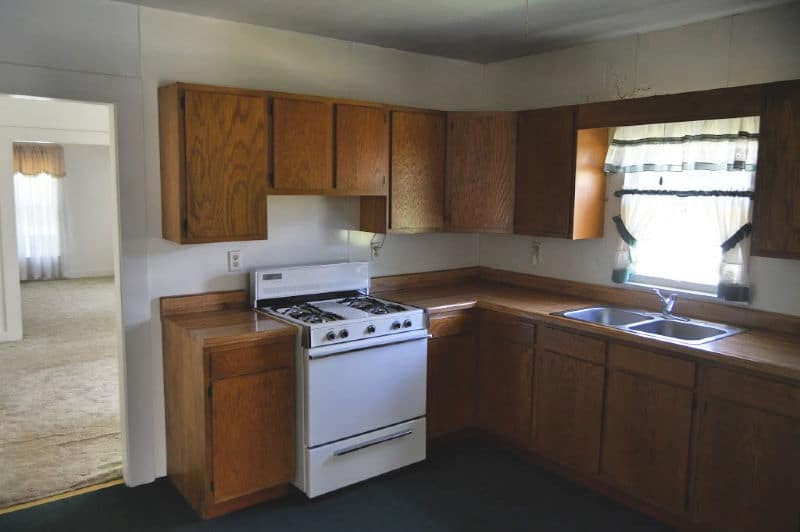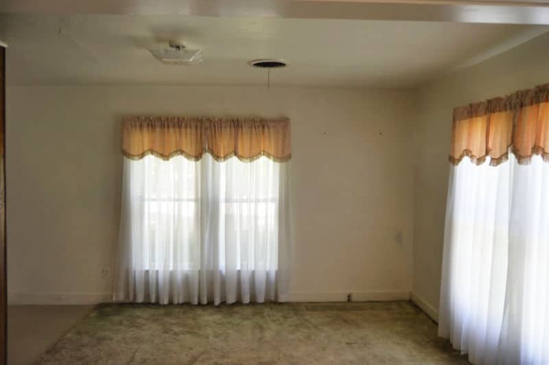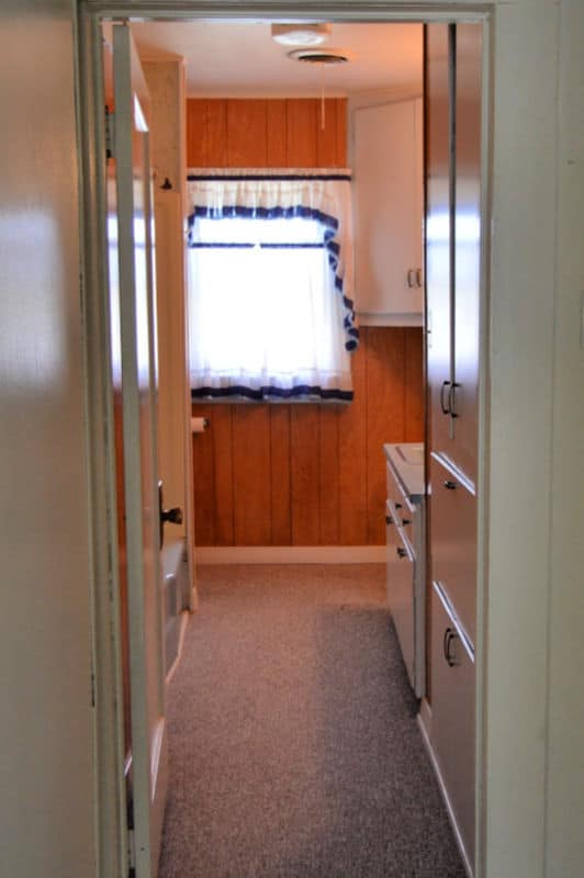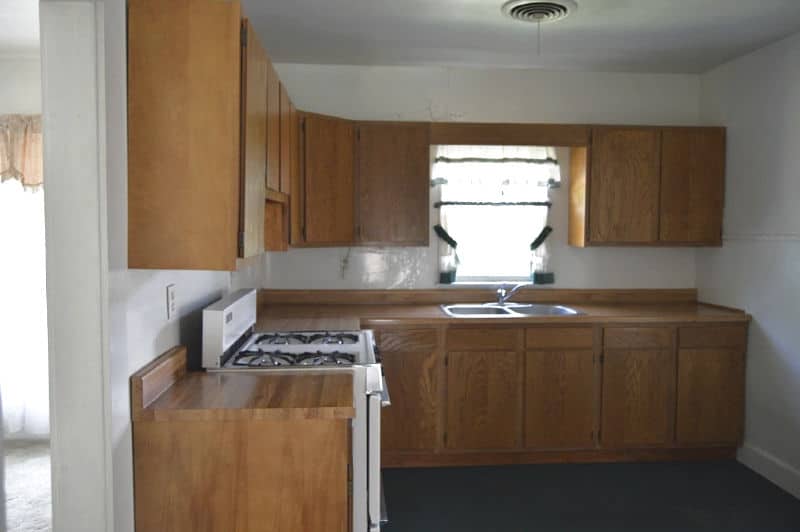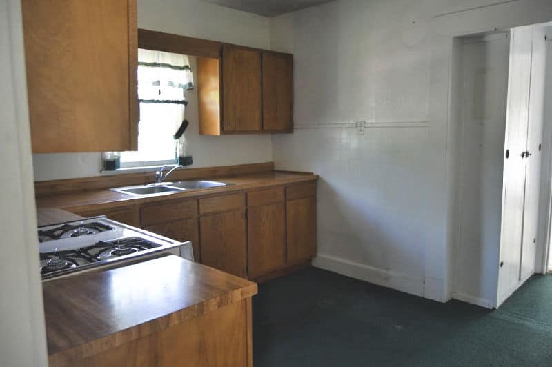The bathroom is one of our current projects, and it’s actually farther progressed than this “during” photo. There was carpet in the bathroom. (Actually, there was carpet throughout the entire house, including the kitchen.)