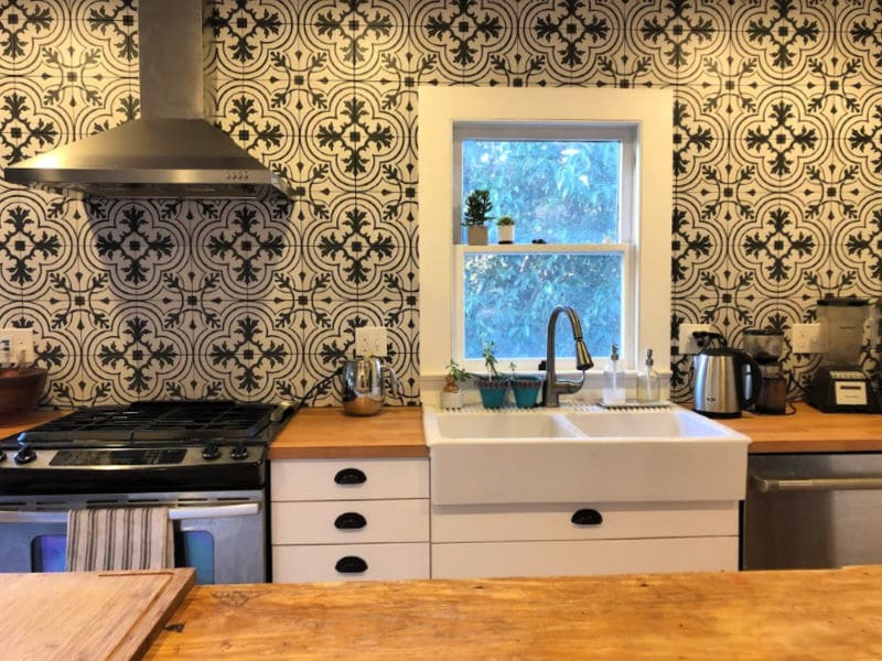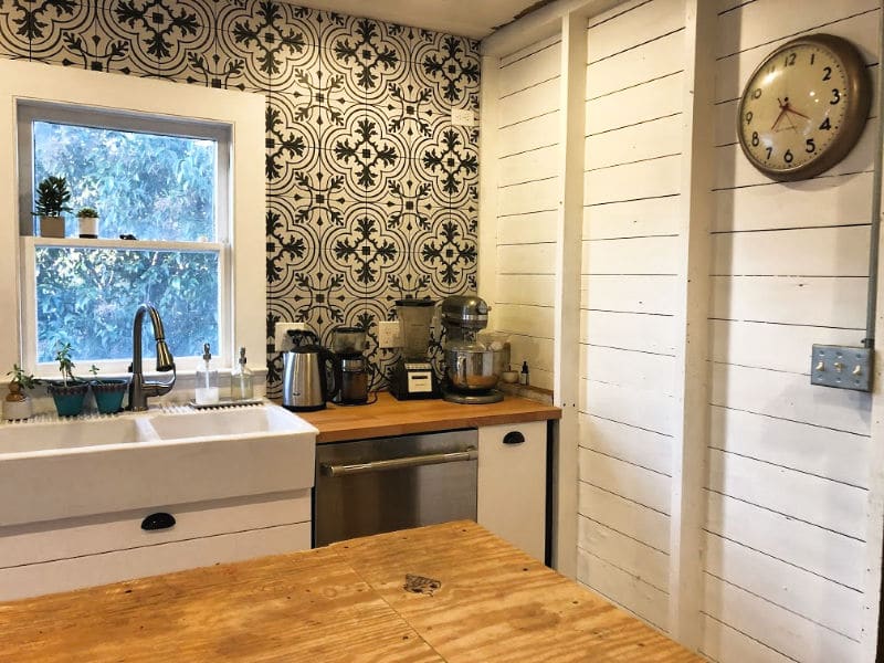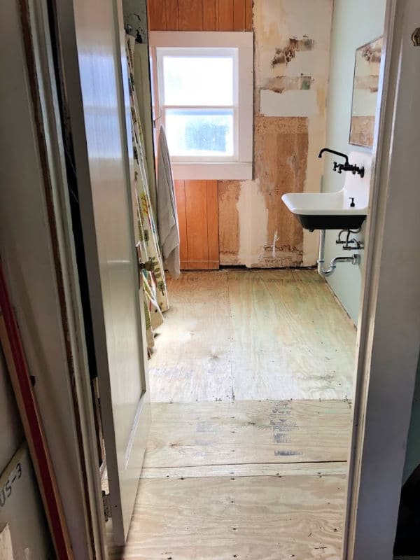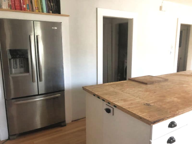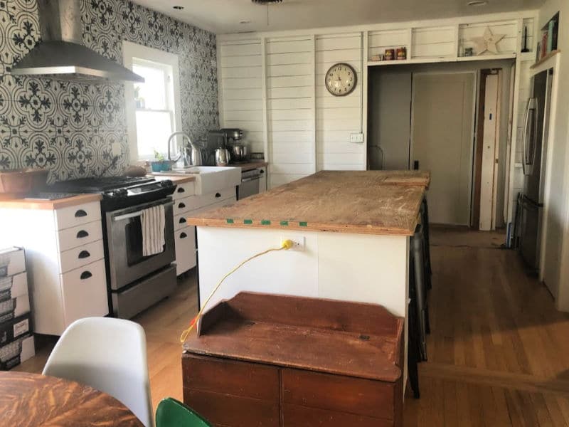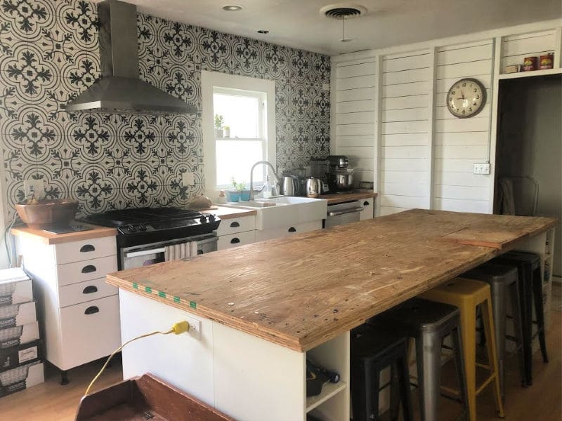 We’ll add Kyle’s custom floating shelves to the tile, and near the end of the renovation, he’ll create a butcher block island top (right now, he likes having the plywood where he can toss tools and work on projects without damage worry).