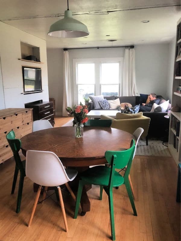 The dining room was a decent size, actually, but because the kitchen was so miniscule, Kyle removed that back wall so that the dining area blends in seamlessly, almost as a little buffer between the living room and kitchen. The pendant lamp was a $5 find from the Habitat ReStore, which I painted milk glass green, but eventually we plan to install a glass pendant. Chairs and table are Craigslist finds.