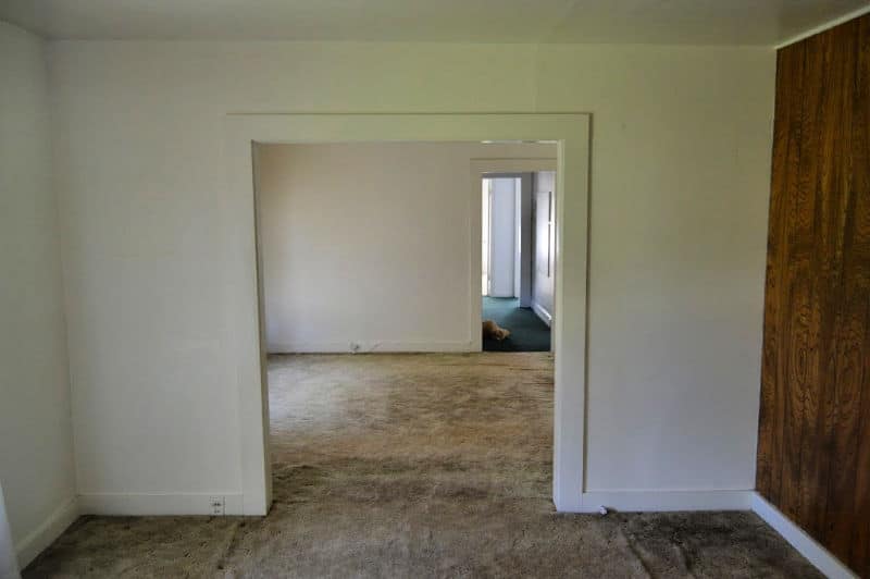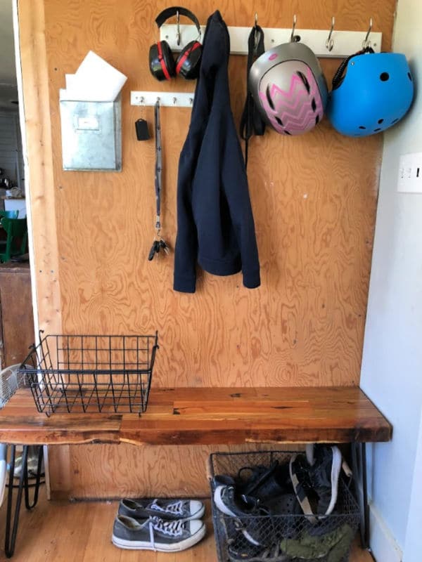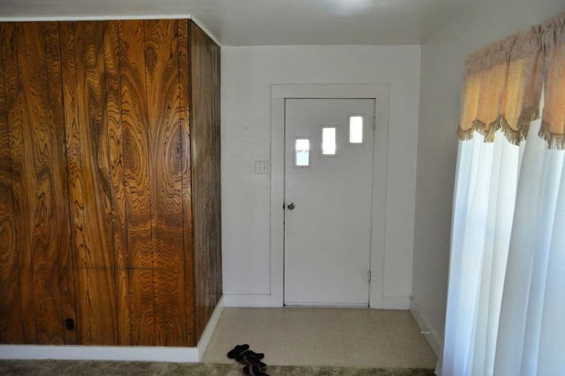 Unlike our Bend house, we don’t have much of an entrance to speak of. The plan eventually is to repurpose shiplap on the (now plywood) entry wall and really customize some organization, but at least we’ve tossed the fake wood paneling. There was a lot of it. Also, new front door made of solid-fir wood. The original door was actually made for interior and in horrible shape.