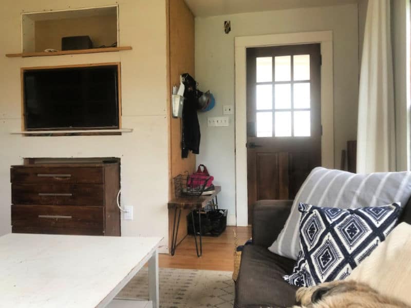 Eventually we’ll have doors over the TV, which is recessed into the wall on a swivel mount. And in the corner by the front door? Those are floating shelves Kyle built from the wall studs he removed; they’ll go on the tiled wall in the kitchen.