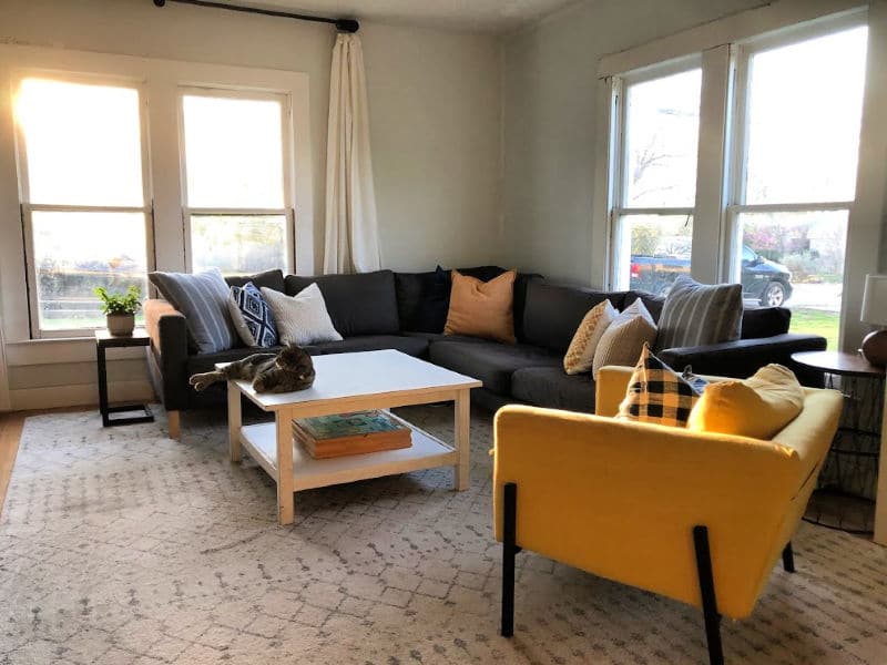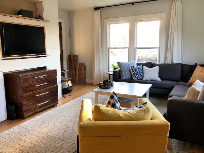 I’ve gone back and forth on curtains, which is why I still don’t have anything on those second set of windows. Right now, these are repurposed Ikea bedspreads, which work beautifully (we also did this in Turkey). But they bunch up behind the sectional, so I’m leaning towards Roman-style bamboo shades, but boy howdy, are they pricey. (Also, these windows are falling apart… they’re high priority to replace soon.)
