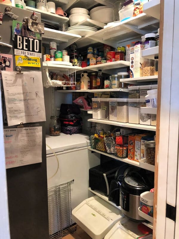 The pantry was formerly this strange half bath in one of the bedrooms. Kyle moved the door to the bedroom back to create a small hallway, then transformed the bathroom into a small walk-in pantry (back of the fridge is on the left).