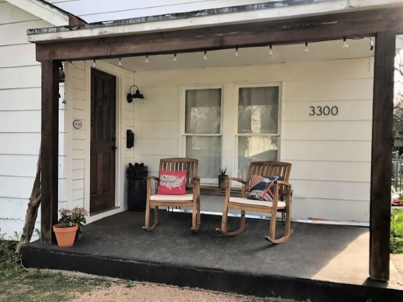 We honestly haven’t touched this much, beyond removing what we didn’t like (hedges and shutters), adding a simple crushed granite walkway, and giving the old exterior a paint refresher. Kyle did, however, do a stellar job with simple cedar porch posts (very Texas) and giving the porch a pick-me-up. Landscaping will come eventually.