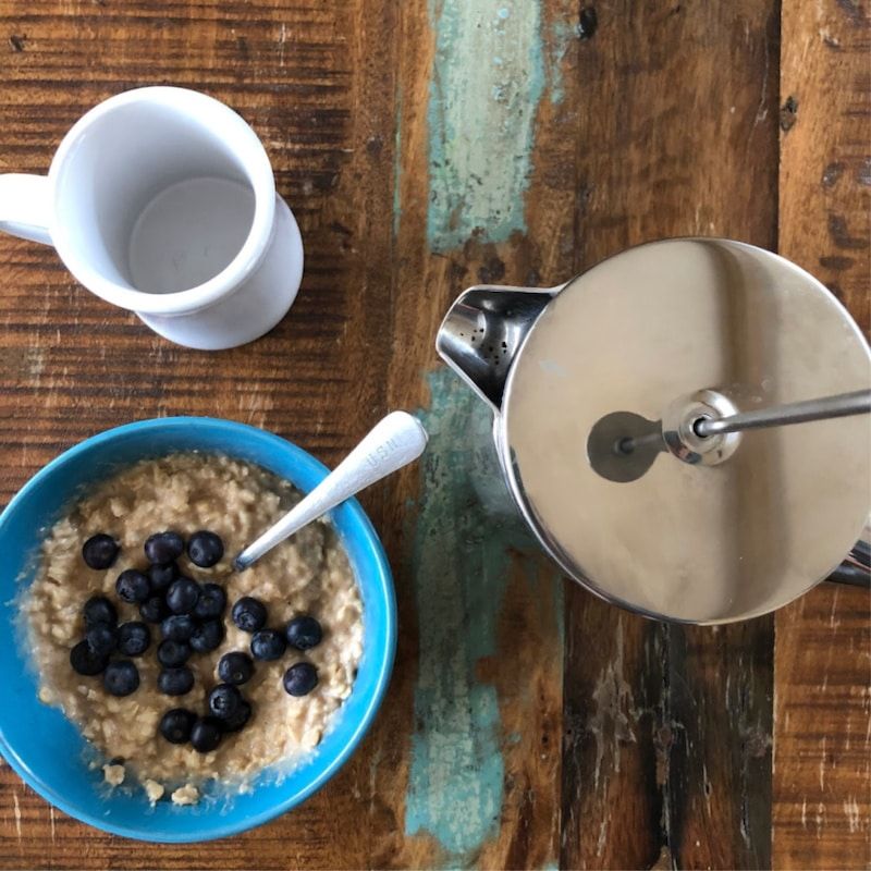 7:15 – I head downstairs and prepare my breakfast and (decaf) French press coffee. Breakfast is old-fashioned oats with almond butter and topped with fresh blueberries.