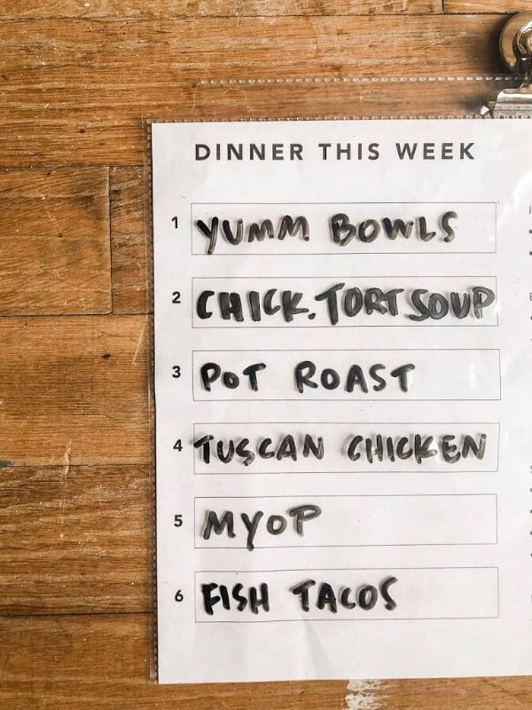 With these three dinners already planned, we then plug in four other meals to the menu plan. But here’s what’s key for us: when we’re deciding what’s on tap at the start of the week, we don’t force these four meals into specific days. We simply write them down on our checklist, then reference the list all week.