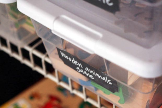 I bought shoebox-sized containers (a dollar each), and cut these chalkboard labels in half to stretch them further (Martha Stewart strikes again).