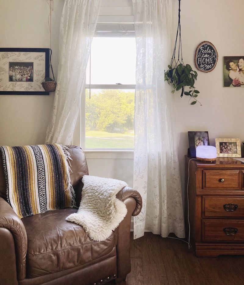 I wiped down the ceiling fan, window sills, windows. I decluttered surfaces and put sentimental items from my girls in a special folder in a drawer or hung the latest on the wall. I found a permanent spot for my essential oil diffuser and filled it with Purify oil. I took down all the hanging plants and gave them a good watering in the claw-foot tub. I moved a leather chair over 3 feet from the corner of our bedroom to under a window, and it literally changed the entire room.