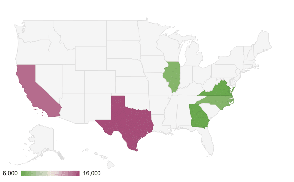Most listeners are in Texas and California, followed by Illinois, Virginia, Georgia, and North Carolina.