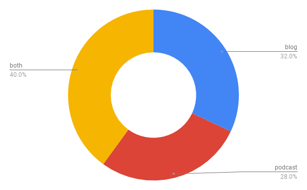 While not-quite half of everyone here both reads the blog and listens to the podcast, roughly half does one but not the other.