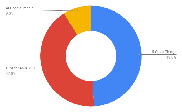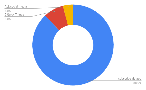Actually, the results skew heavily on you guys subscribing to the feed in a podcast player (like Overcast, or simply the native ones on your phones). This naturally makes me happy — personally, as a listener of several shows, it’s the only way I can keep up with new episode drops, too.