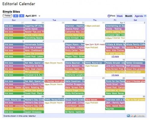 Simple Mom’s content is planned a month at a time, at minimum. My preference is two months at a time, just for my sanity. All SLM sites’ editorial calendars are on Google Calendar, and we can all access them at any time, to see what’s on the docket for each site. Each contributor can also see the calendar of the site they write for.