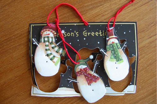 I like to cut out the images as I get them—hearts, snowmen, leprechauns. I punch a hole in my cutout and string through a scrap of ribbon or twine. My tags are kept in an envelope with the rest of my wrapping supplies.